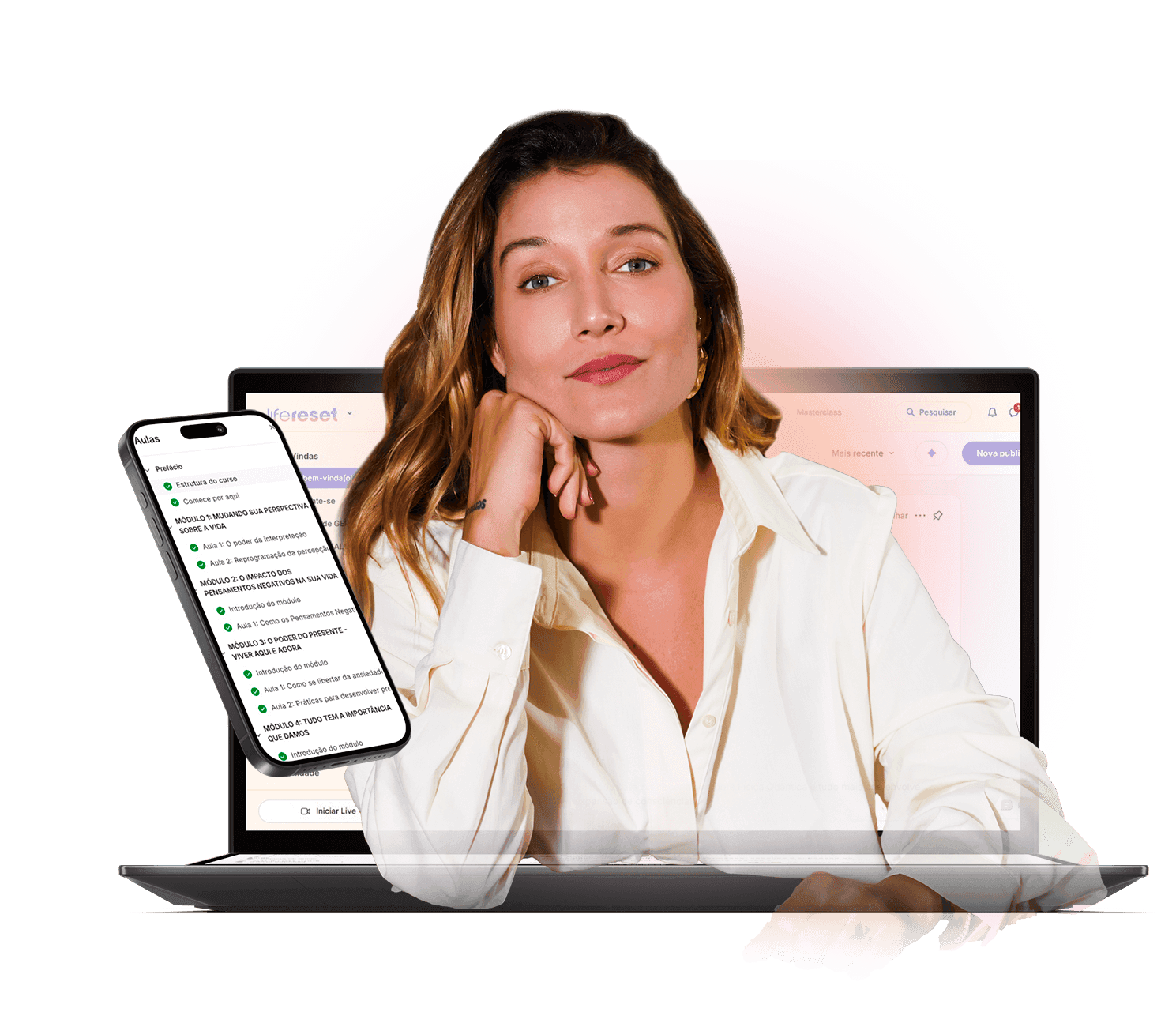 “Eu já estive perdida, desconectada de mim. Mas quando aprendi a reprogramar minha mente e vibrar diferente, tudo mudou. O Life Reset é exatamente isso: um caminho de volta pra sua verdade.“